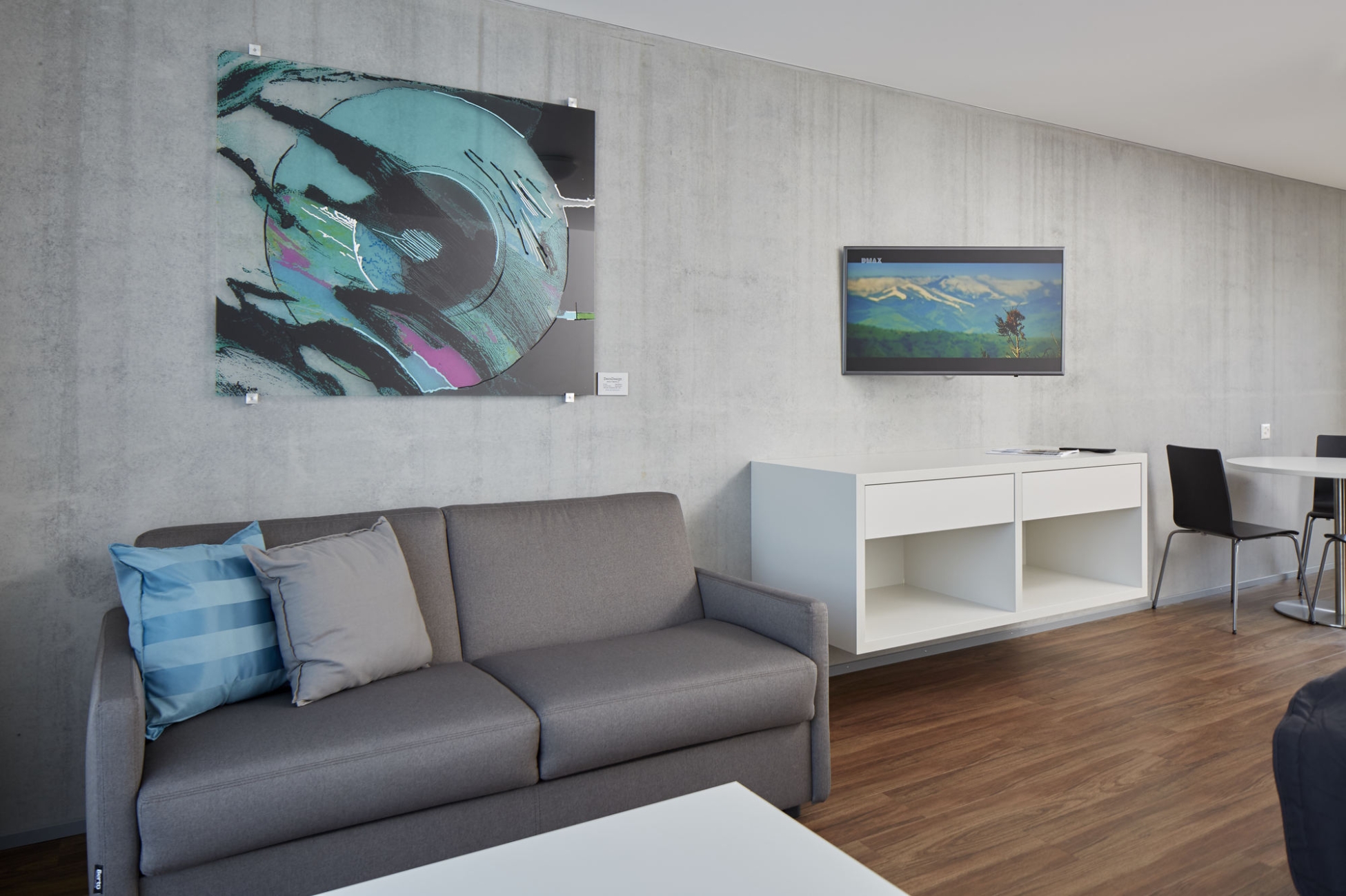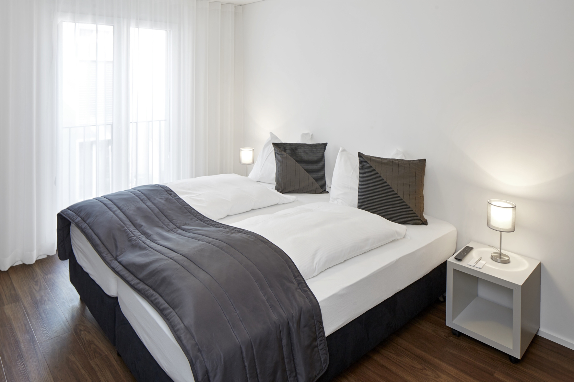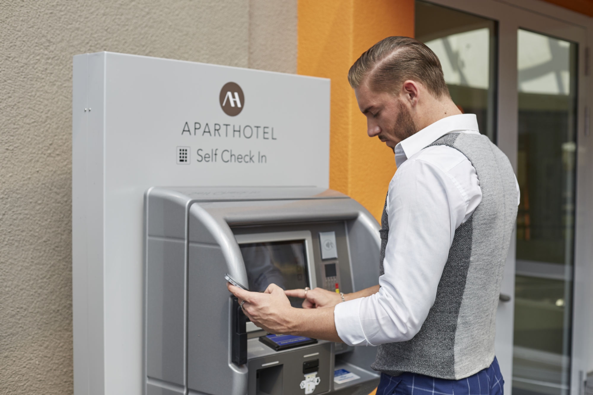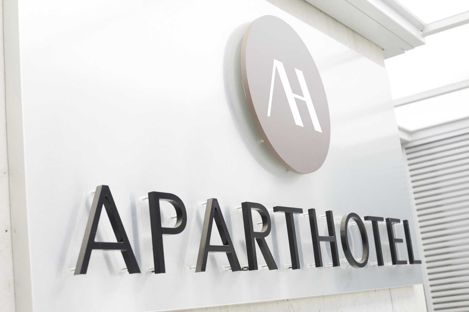 Exterior facade of the apart hotel near zurich in modern design Facade Aparthotel Baden Reception Guest is welcomed at the reception in the apart hotel near zurich Top-floor room with terrace and kitchenette Top-floor room lounge Top-floor room kitchenette Nespresso coffee machine on the kitchenette of the apart hotel near zurich Business room without balcony Business room with balcony and kitchenette Business room kitchenette Business room shower and toilet Self check-in desk Logo Entrance hall